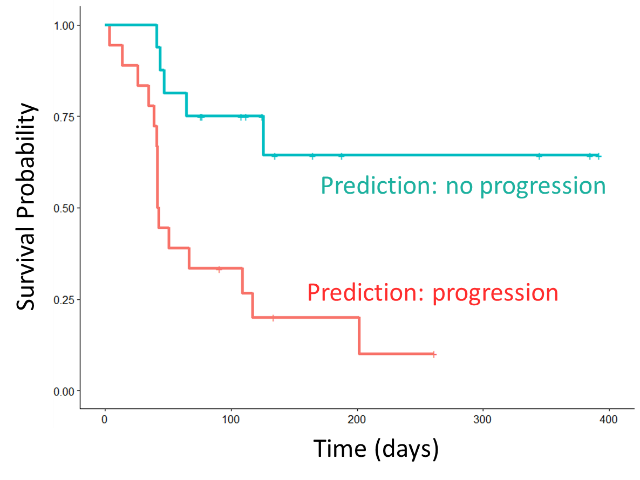 Predictive performance may improve when combined with existing biomarkers: This is achieved when tyrosine kinase activity profiling is combined with low tumor PD-L1 expression in NSCLC patients, as depicted on the right. Validation of the results in an independent patient cohort is currently ongoing.